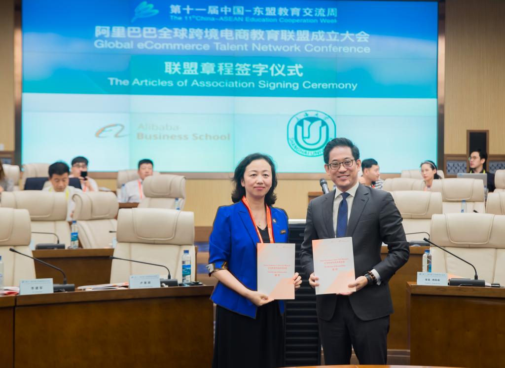 7月26日,在贵州举办的第十一届中国-东盟教育交流周上,我校党委副书记、副校长龚思怡与阿里巴巴集团副总裁黄明威共同签署合作协议,上海大学成为全球跨境电商教育联盟(简称“GET联盟”)首批高校。