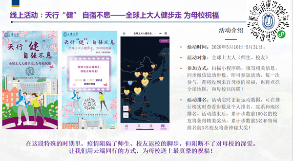 杨静向日本校友介绍了学校发展近况,尤其是在人才培养、科学研究和国际化等方面取得的骄人成绩,回顾了新冠疫情中海内外上大人的家国情怀与社会担当,并围绕2020年学校工作计划介绍了“天行健 自强不息——全球上大人健步走,为母校祝福”、“全球校友召集令”、“临泮校友云讲坛”、“四海同心云端会议”等一系列线上活动,邀请海外校友共同参与,传递情谊。