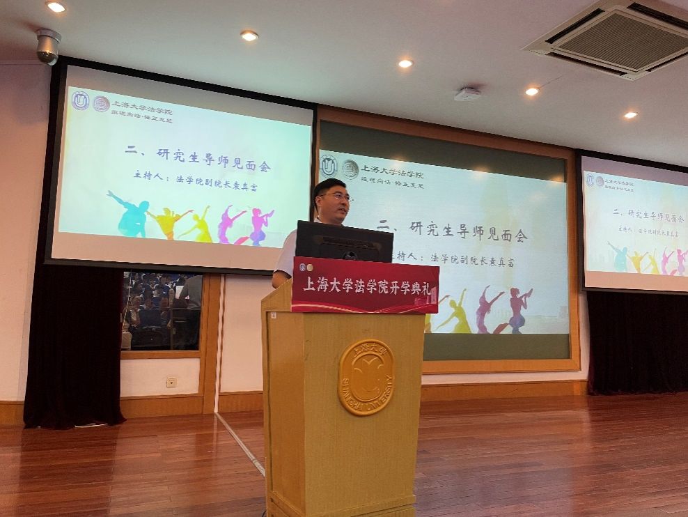 在这秋风送爽,硕果飘香的季节,法学院本研师生欢聚一堂,于9月1日下午,在宝山校区J202方润华讲堂举行2023年新生开学典礼暨研究生导师见面会。法学院党委书记徐国明老师,法学院院长李凤章老师、法学院党委副书记副院长于伟老师、法学院副院长袁真富老师、优秀校友代表、泰和泰(上海)律师事务所律师、高级合伙人应莹律师、泰和泰(上海)律师事务所专家顾问谢云泽律师,学院全体教师和新生参加。开学典礼由法学院2023届硕士研究生连顺祥主持。