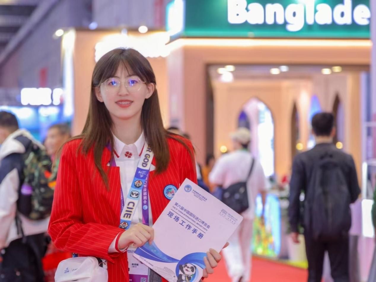 在进博会期间,我作为国家展上海大学志愿者联络员,主要负责国家展上海大学志愿者的协调对接,以及与各国别展台人员的沟通交流等工作。