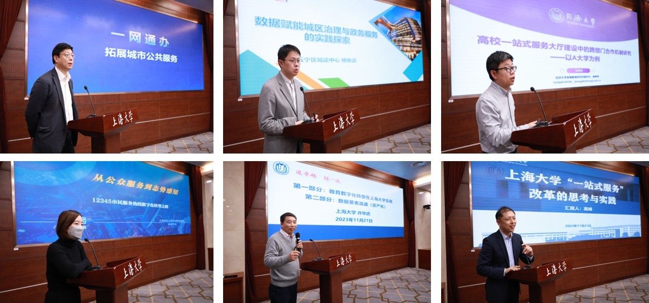 11月21日,上海大学数据治理与一站式服务改革研讨会在上海大学宝山校区成功举办。上海大学党委副书记欧阳华,上海市大数据中心副主任朱俊伟,长宁区科学技术委员会副主任、大数据中心主任杨维诘,同济大学高等教育研究所副所长张端鸿,宝山电信局技术总监谢青宇,上海电信上海市民服务热线运营中心副主任彭倩,上海大学党政办公室主任、政策研究室主任秦凯丰,机关党委书记钱峰,信息化工作办公室主任许华虎,学生工作办公室主任、武装部部长孟祥栋,档案馆馆长卢志国,党政办公室副主任、信访办主任于瑞强,党政办公室副主任、法务办主任陈敬根,财务处副处长朱振英、招生就业处副处长贺利,信息化工作办公室副主任顾爱军,政策研究室副主任杨国兰,一站式服务中心主任高峰以及部分部处相关业务负责人参加了本次研讨会。