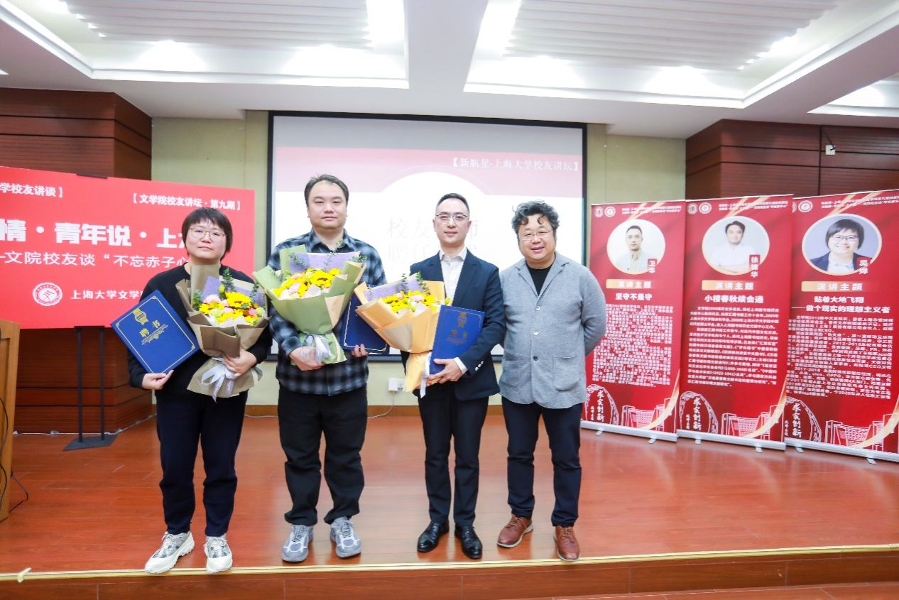 微演讲环节之后,文学院正式聘任三位优秀校友为“上海大学文学院校友导师”,由文学院党委副书记、院长刘旭光老师为三位校友颁发“校友导师”聘书,并送上鲜花。