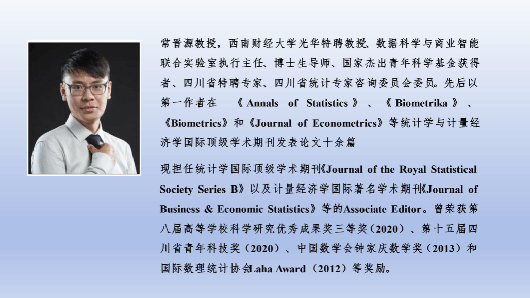 常晋源教授的报告主题是“Exploring Excellence: Bayesian Penalized Empirical Likelihood and MCMC Sampling”,旨在探讨贝叶斯惩罚经验似然的新方法论框架。常教授在报告中提出了两种方案,第一种是通过调节拉格朗日乘子的方法来有效地选择模型条件,第二种是通过有效降维的方法来克服贝叶斯应用设计采样方案中固有的困难。该研究提供了一种灵活而高效的方法,增强了经验似然方法在统计推断中的适用性,为研究人员和其他学者提供了解决复杂问题的新方法。