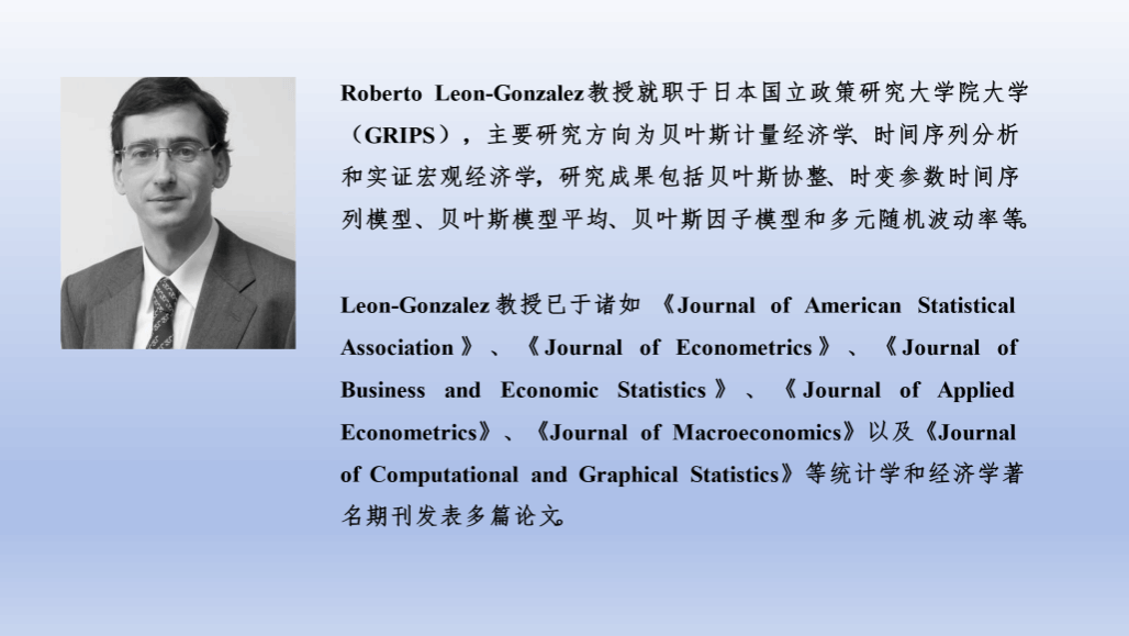 Roberto Leon-Gonzalez教授的报告主题是“Approximate Factor Models with a Common Multiplicative Factor for Stochastic Volatility”。Leon-Gonzalez教授深入研究公共乘法因子随机波动率模型,提出逆Gamma过程的CSV模型,通过对比日本、巴西、美国和英国4个国家的实证结果表现,该模型与其他CSV模型相比具有更好的预测精度,显示出其在宏观经济和金融领域的卓越性能,为贝叶斯计量经济学发展贡献了新视角。