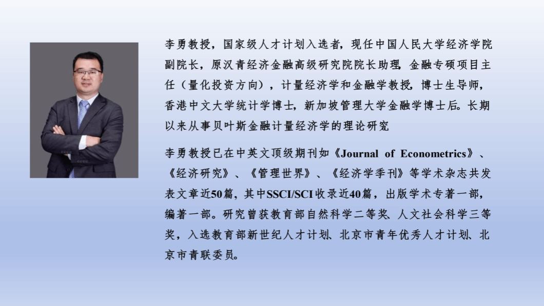 李勇教授的报告主题是“Risk of Predictive Distributions and Model Comparison on Misspecified Model”。李教授指出,对于可能存在错误设定的模型,从预测的角度来看,通常有三种不同的预测分布可供候选使用,即插入式预测分布、常规的贝叶斯预测分布以及Muller(2013)提出的夹层贝叶斯后验预测分布。在K-L损失函数下,李教授和合作者证明了夹层贝叶斯预测分布比常规贝叶斯预测分布具有更低的渐近风险,提出了存在错误设定情形下的信息准则,并通过在经济学和金融领域的实证分析展示了其实际应用。