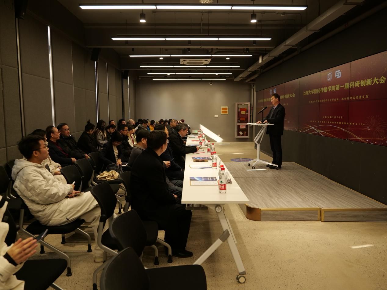 2024年1月26日上午,上海大学新闻传播学院第一届科研创新大会在延长校区上海智能媒体传播创新实验中心104室顺利举行。本次大会的主题是“构建面向中国式现代化的学科创新,推动科研高质量发展”。