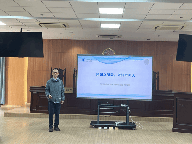 在朋辈交流环节,法学院2020级知产专业本科生周雍捷同学介绍了知产专业的优势、与法学专业的关系和知识产权的学习日常等内容。