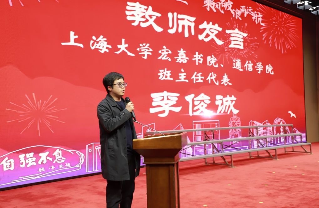上海大学宏嘉书院、通信学院教师李俊诚作为班主任代表发言,他希望学子们珍惜青春,把握机遇,在人工智能引领社会发展的时代,养好学习习惯,巩固专业基础,以专业本领服务国家发展,勇担时代担当。