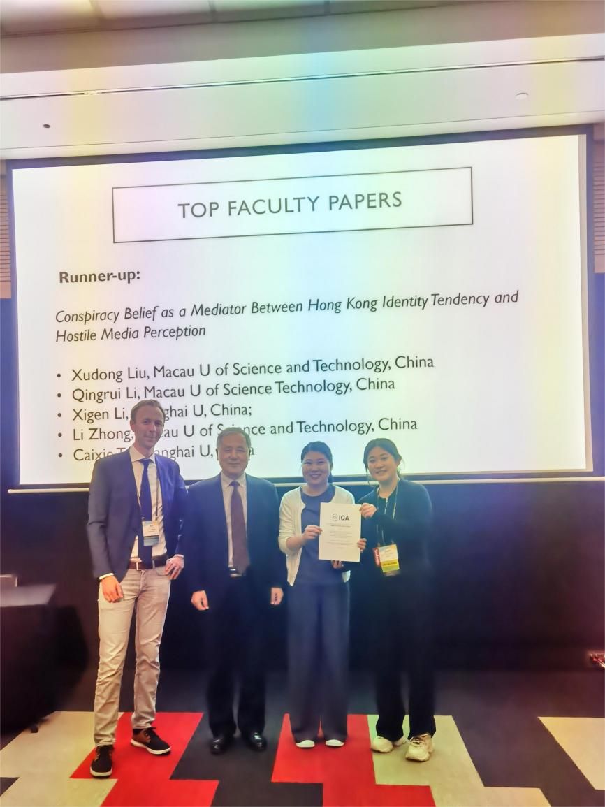 值得一提的是,学院师生团队在本次年会上荣获多项荣誉和资助。其中,学院特聘教授李喜根、博士后屠采撷与澳门科技大学副教授柳旭东等人合作撰写的论文“Conspiracy Belief as a Mediator Between Hong Kong Identity Tendency and Hostile Media Perception”荣获国际传播学会大众传播分会(Mass Communication Division)“最佳教师论文奖(亚军)”。