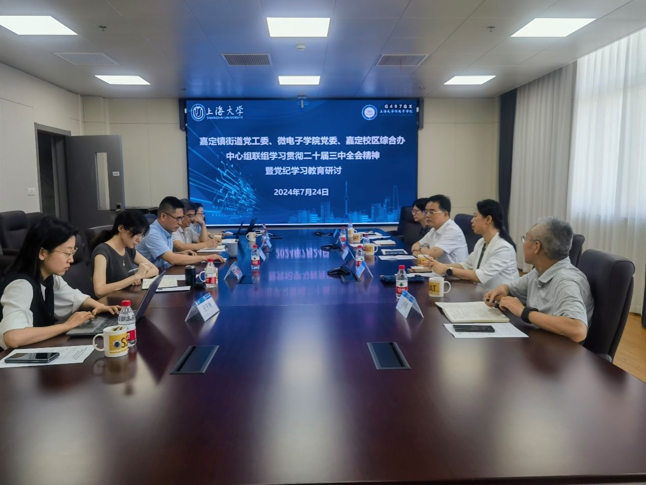 7月24日上午,嘉定镇街道党工委、微电子学院党委、嘉定校区综合办在上海大学嘉定校区微电子学院A313会议室举行中心组联组学习贯彻二十届三中全会精神暨党纪学习教育研讨会,嘉定镇街道党工委书记徐嵘、党工委副书记张敏、街道办事处副主任冯晴、副主任王同春、街道党政办主任逄诣炯,上海大学微电子学院党委书记、嘉定校区综合办主任郭纯生、嘉定校区综合办副主任张其、微电子学院党委副书记余丽娜、副院长路秀真,以及学院青年教师代表、教工党支部书记、青联会主席任开琳出席会议。会议由郭纯生同志主持。