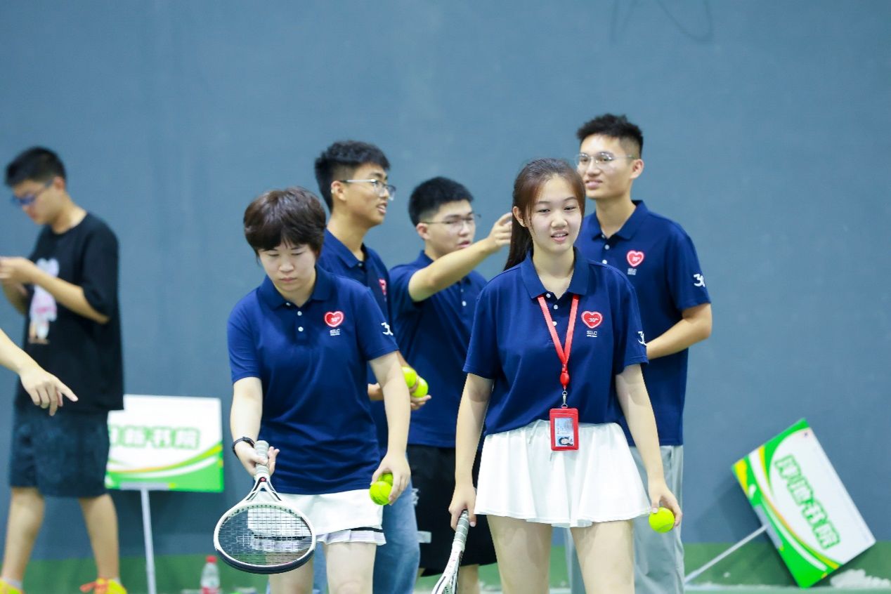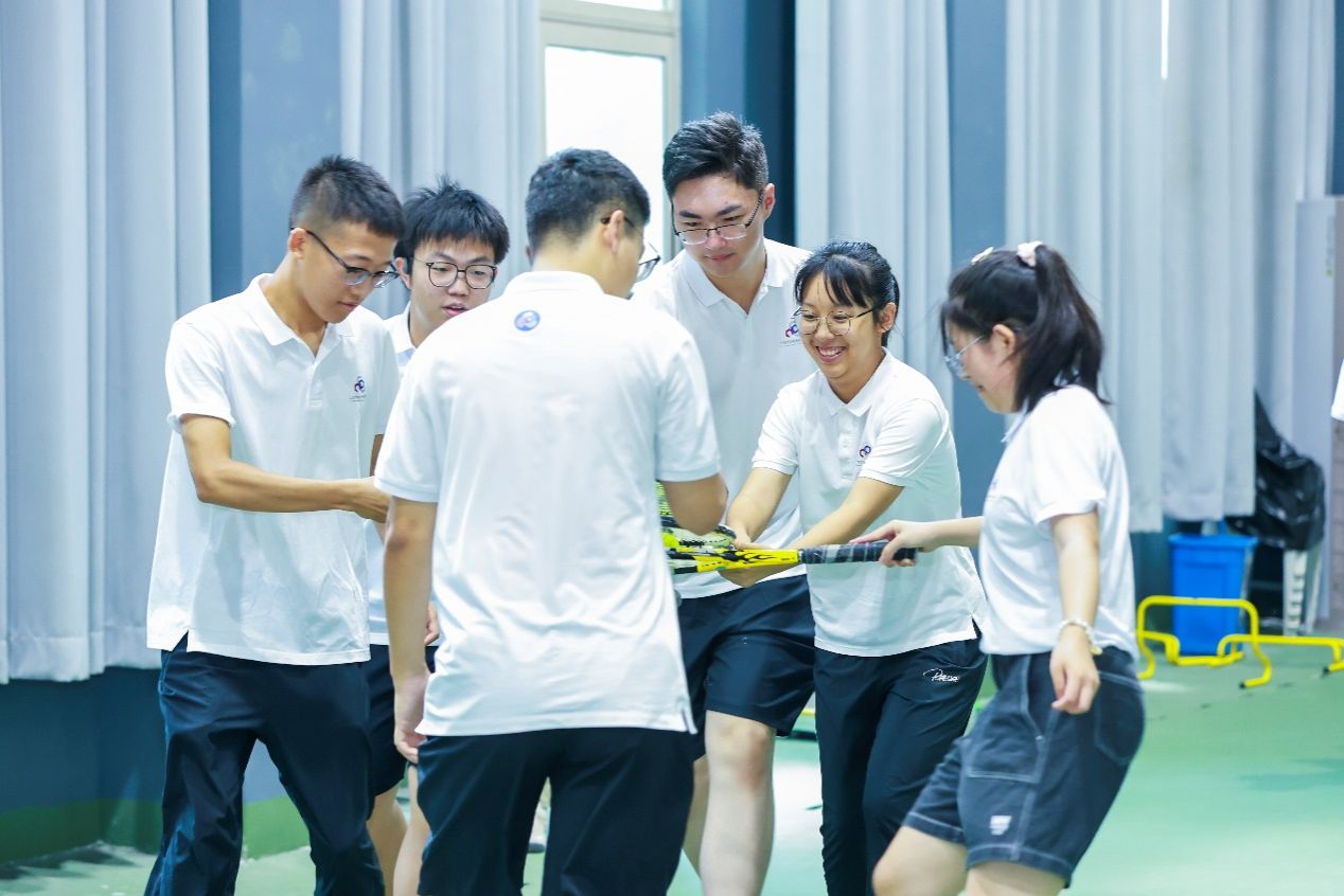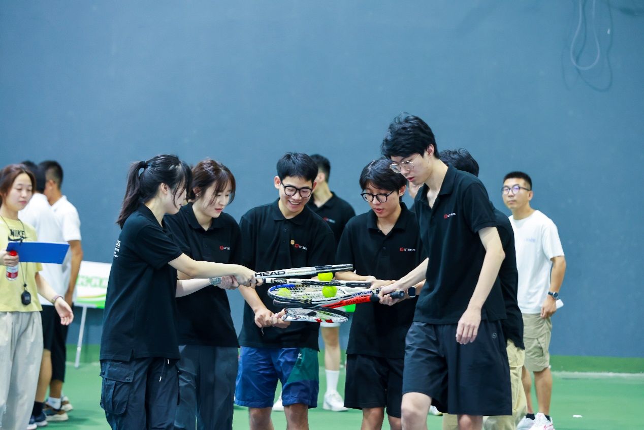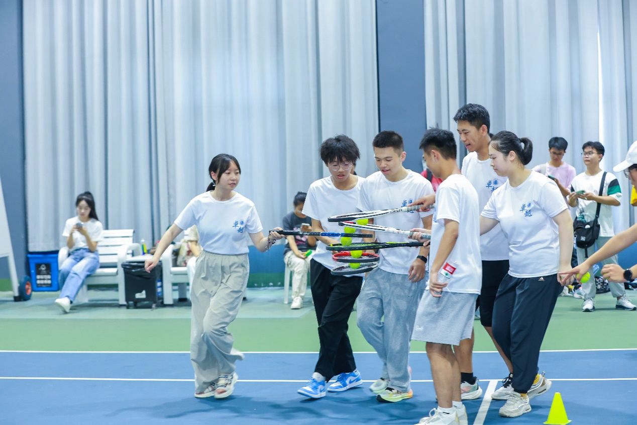 第三个项目是团队金字塔。网球拍与网球,在手中化作智慧的金字塔,穿越障碍,展现无限可能。