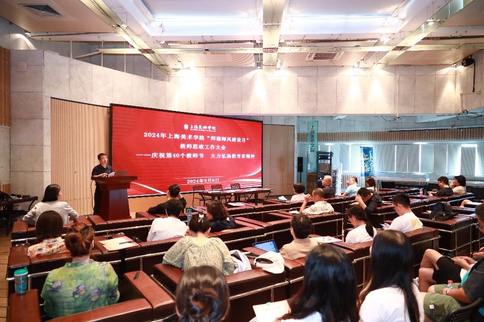 为深入学习贯彻党的二十大和二十届二中、三中全会精神,在迎接第40个教师节之际,上海大学上海美术学院以“大力弘扬教育家精神,加快建设教育强国”为主题,于9月6日上午开展2024年“师德师风建设月”活动暨教师思政工作会议。会议由学院党委副书记、纪委书记宋国栓主持,学院党政班子成员、各系部教师代表、新老教师结对代表等共计60余人参加。