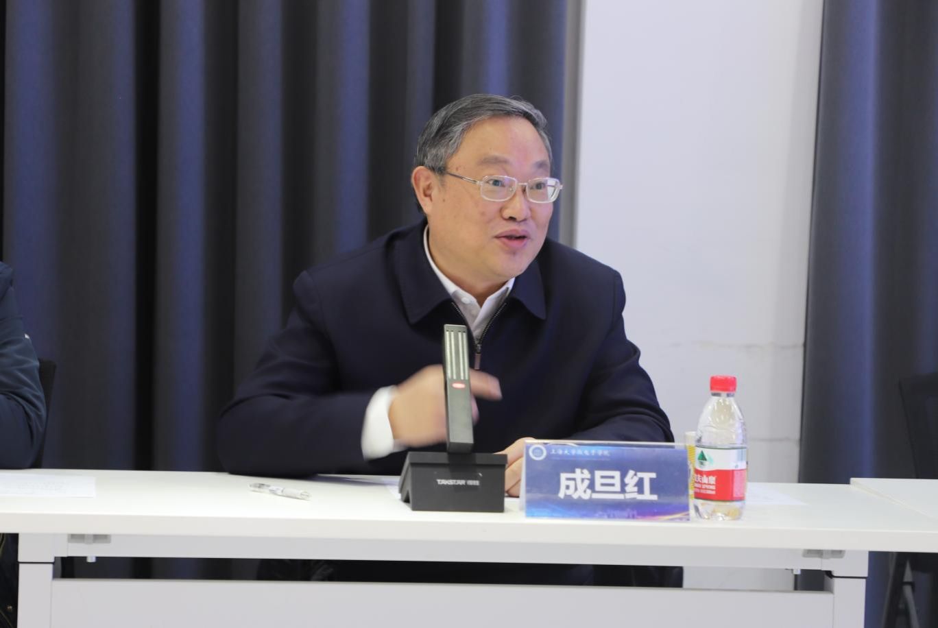 成旦红书记充分肯定了微电子学院在平台建设、项目申报、成果建设和人才引育方面做出的成绩。他希望微电子学院全体师生,一是继续保持积极进取、勇于奋斗的精神,以“非做不可、非我莫属、非同凡响”的意识,落实学校第四次党代会精神,按照学校教育大会提出的“1+2+6”改革举措,推动微电子学院学科建设、专业设置、人才培养、AI 赋能等方面有新的积极作为。二是要以只争朝夕的扎实作风,在集成电路关键核心技术突破和人才培养方面铆足劲,完成学院“十四五”规划目标,在“十五五”规划方面做出新设想。三是牢记市委市政府建设准工业化、国际化一流微电子学院的嘱托,化压力为动力,强化党建引领,落实“人人进团队、人人有项目、人人入主流、人人讲奉献”工作要求,聚焦“大平台、大项目、大成果、大人才”重点方向,尽快实现突破,努力创造实实在在、非同凡响的成果。
