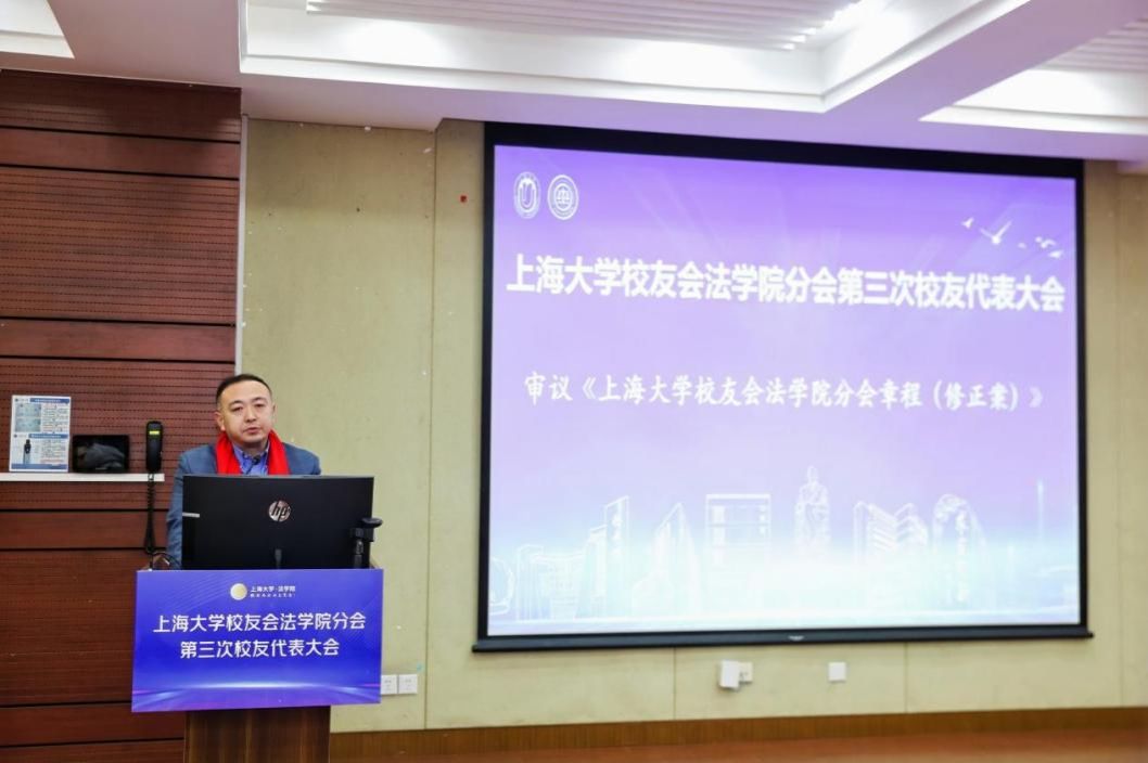 为了进一步密切广大校友和学校学院的联系交流,打造校友与学校学院共同发展的命运共同体,为上海大学和上海大学法学院的高质量发展凝聚智慧力量,上海大学校友会法学院分会第三次校友代表大会于12月29日上午在上海大学宝山校区东区蔡冠深讲堂顺利召开。上海大学对外联络处副处长、校友办副主任杨静,法学院党委书记徐国明,法学院党委副书记、院长李凤章,法学院党委副书记、副院长于伟,法学院校友分会第二届理事会会长石峰及来自全国各地的近百名校友代表参加了本次大会。