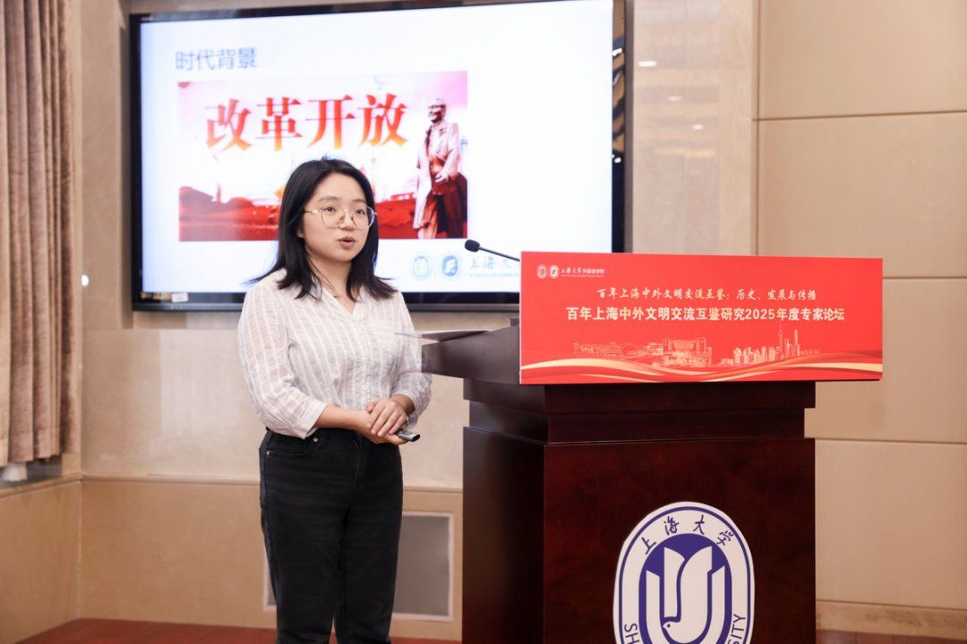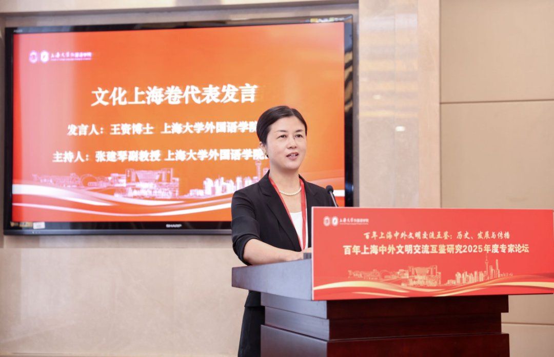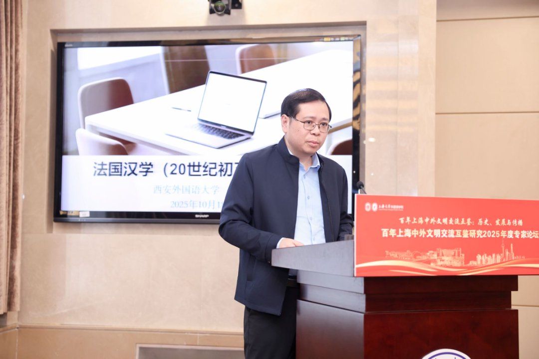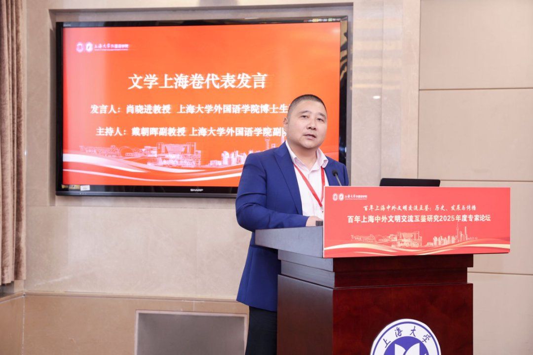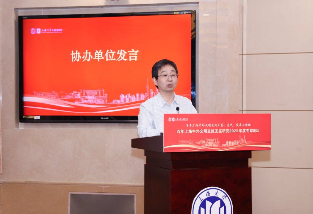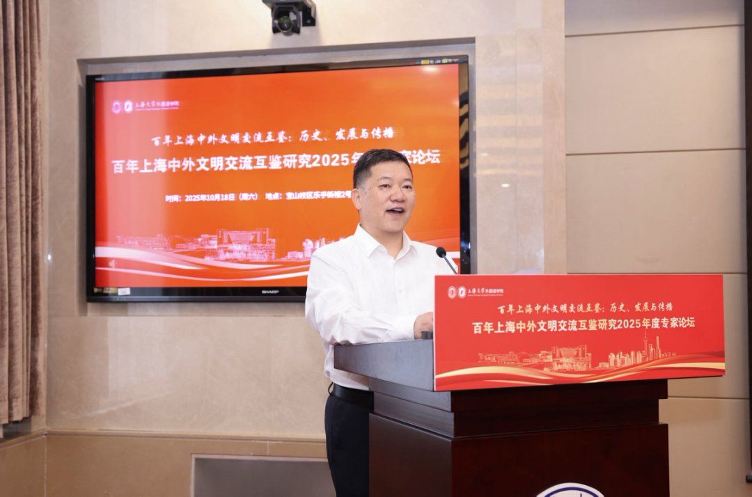 秋日泮池,碧波荡漾,思想交融。10月18日,上海大学外国语学院在上海大学宝山校区乐乎新楼学海厅举行“百年上海中外文明交流互鉴:历史、发展与传播——百年上海中外文明交流互鉴研究2025年度专家论坛”,本次论坛由上海外语教育出版社、上海市外文协会协办。第十三届、十四届全国政协常委、西安外国语大学原校长户思社教授,上海外语教育出版社社长助理高云松,上海外语教育出版社田慧肖、杨洋,西安外国语大学齐赵园、朱维嘉,华东理工大学陈丽、何玮,上海海事大学郭海霞、张宏雨、莫为,上海外国语大学张彩迪,河南安阳工学院郭欣,山东科技大学伊丹丹,上海大学刘娇蕾等校内外学者,学院党政领导班子及师生代表等出席此次会议。