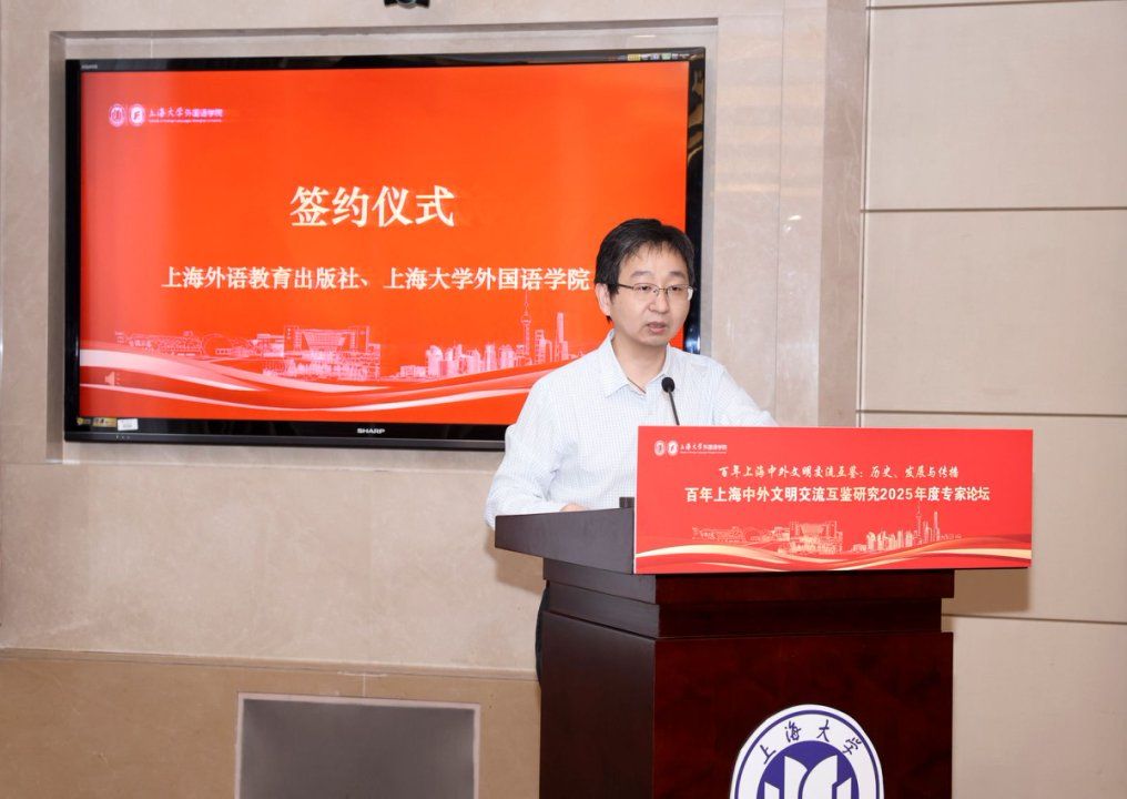 上海外语教育出版社社长助理高云松与外国语学院院长尚新共同签署了合作框架协议。高云松先生表示,上海外语教育出版社将与上海大学外国语学院紧密合作,围绕“百年上海中外文明交流互鉴”主题,汇聚各方特色优势,全力打造涵盖学术出版与国际传播的精品项目,助力中外文明互鉴研究。