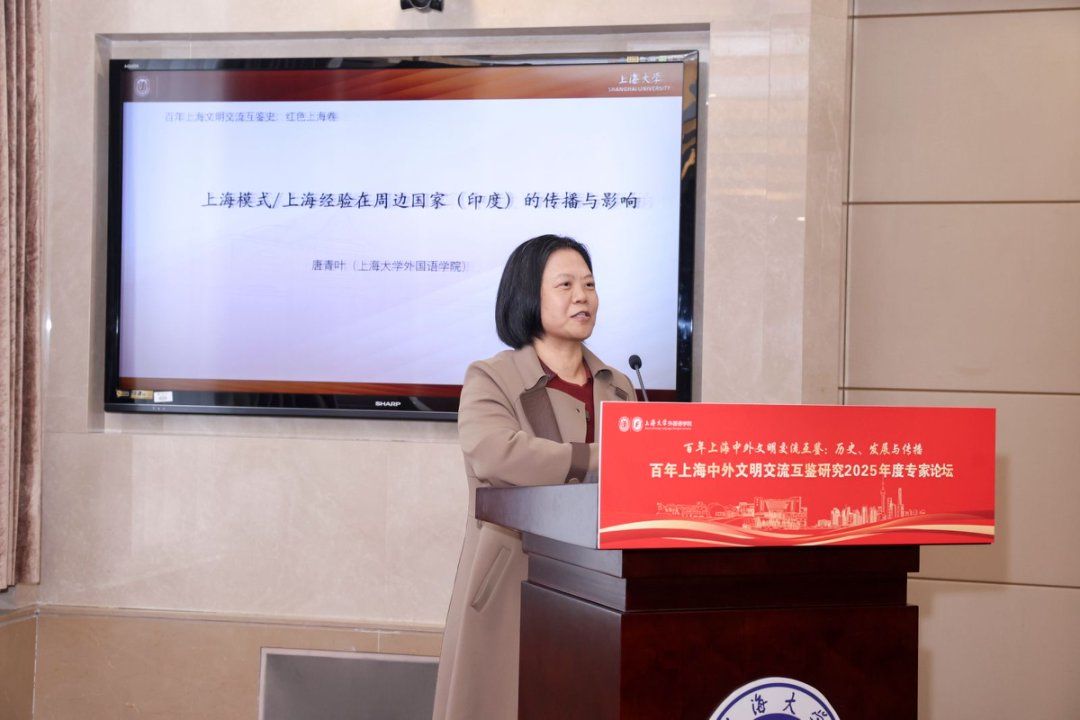 红色上海版块主旨报告由外国语学院张秀丽副教授主持。上海大学外国语学院肖福寿教授以“上海解放与城市接管”为题,提出创新的“RBaSPSI”分析框架。肖教授以此为脉络,回顾了半殖民地的历史背景,厘清了上海城市接管的三个阶段,并从上海文化视角出发,旨在为当代全球治理提供富有启发的中国经验。上海大学外国语学院副院长唐青叶教授围绕“上海模式/上海经验在周边国家(印度)的传播与影响进行报告,聚焦于上海经验在印度孟买的传播,她指出,这一过程始于对“上海模式”的解构与模仿,继而发展为从单向学习到双向对话的深刻反思,最终实现了基于城市合作的本土化创新,成就了卓有成效的中外文明互鉴实践。