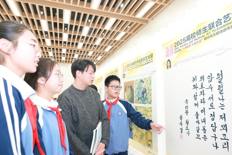 本次展览展示的画作来自全国各地16所高校教师、画院画家和香港、韩国高校教师作品,在艺术语言和表现形式上呈现出丰富的多样性。师生们在艺术作品前或驻足细观,或轻声交流。七年级(1)班学生王妤心被一组以蓝色为基调的拓印作品吸引:“我很想了解这种层层叠叠的技法是怎么实现的,希望能在美术课上也尝试‘复刻’出来。”六年级(6)班学生赵昕悦站在一幅工笔花鸟画前细细品味:“我特别喜欢这样细腻的刻画,小鸟的羽毛根根分明,让我想起我养的小鸟。”