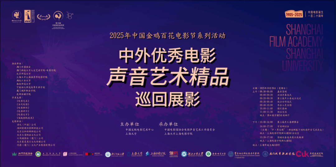 10月26日,2025年中国金鸡百花电影节系列活动之一,中外优秀电影声音艺术精品(上海站)巡回展影在上海大学延长校区顺利开幕。同期还举行了中国电影家协会电影声音艺术工作委员会第三届委员会成立仪式、“声·界无垠” 科技赋能下的电影声音艺术表达学术研讨会、影视设备技术展示及路演等系列活动。