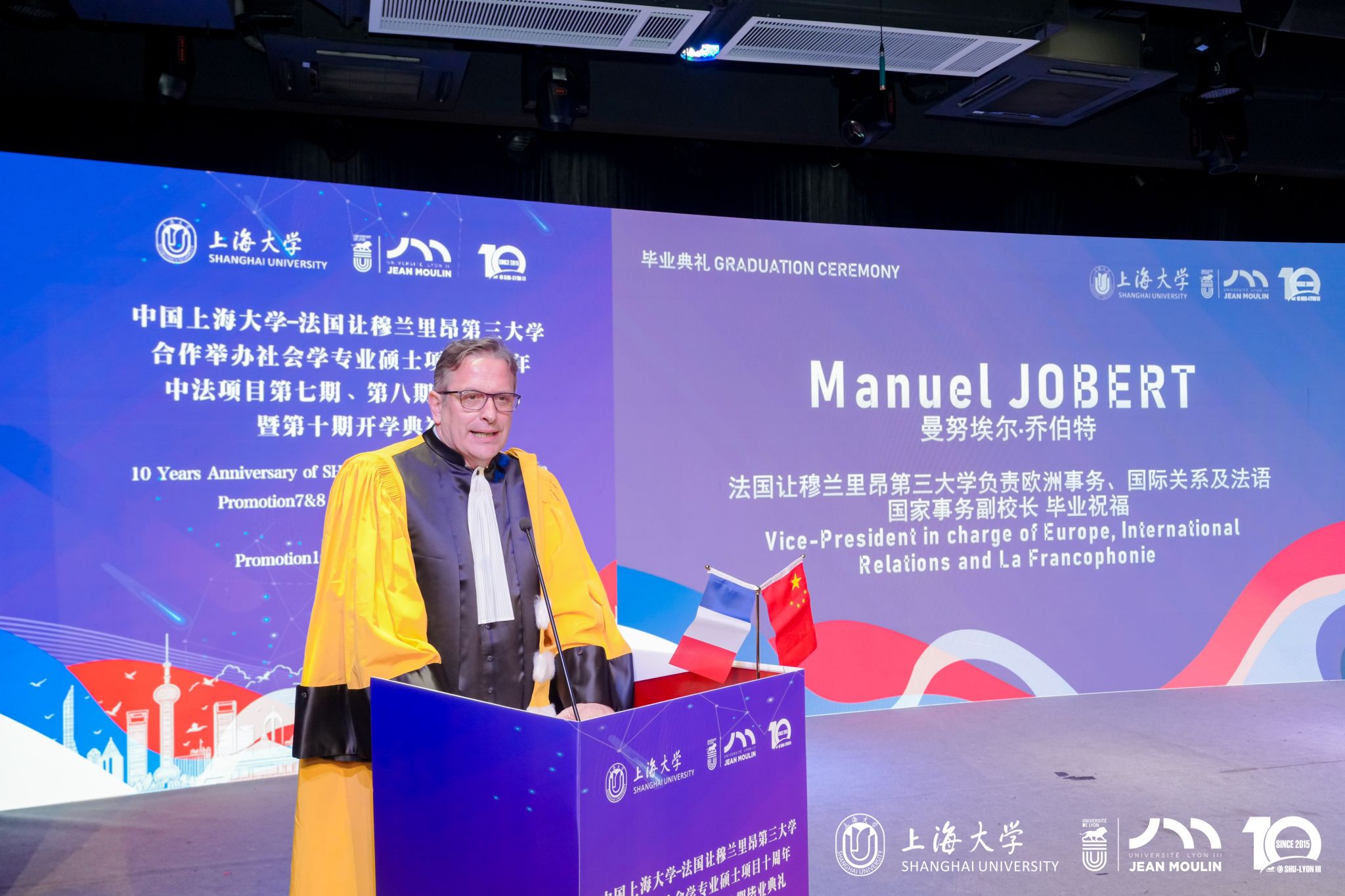 在第七、八期毕业典礼和第十期开学典礼上,里昂三大负责欧洲事务、国际关系及法语国家事务副校长Manuel JOBERT和上海大学国际部党委副书记、副部长、国际合作处处长崔巍为毕业生送上毕业祝福。中法两国在推动生态转型方面肩负共同使命,毕业生作为人文交流使者,其双文化视角是连接两大文明的天然纽带。校方寄语毕业生,将所学转化为破解乡村振兴、低碳发展、城市社会治理等现实问题的能力,承载两校厚望与两国人民对美好世界的共同向往,书写新一代社会学人的新作为。