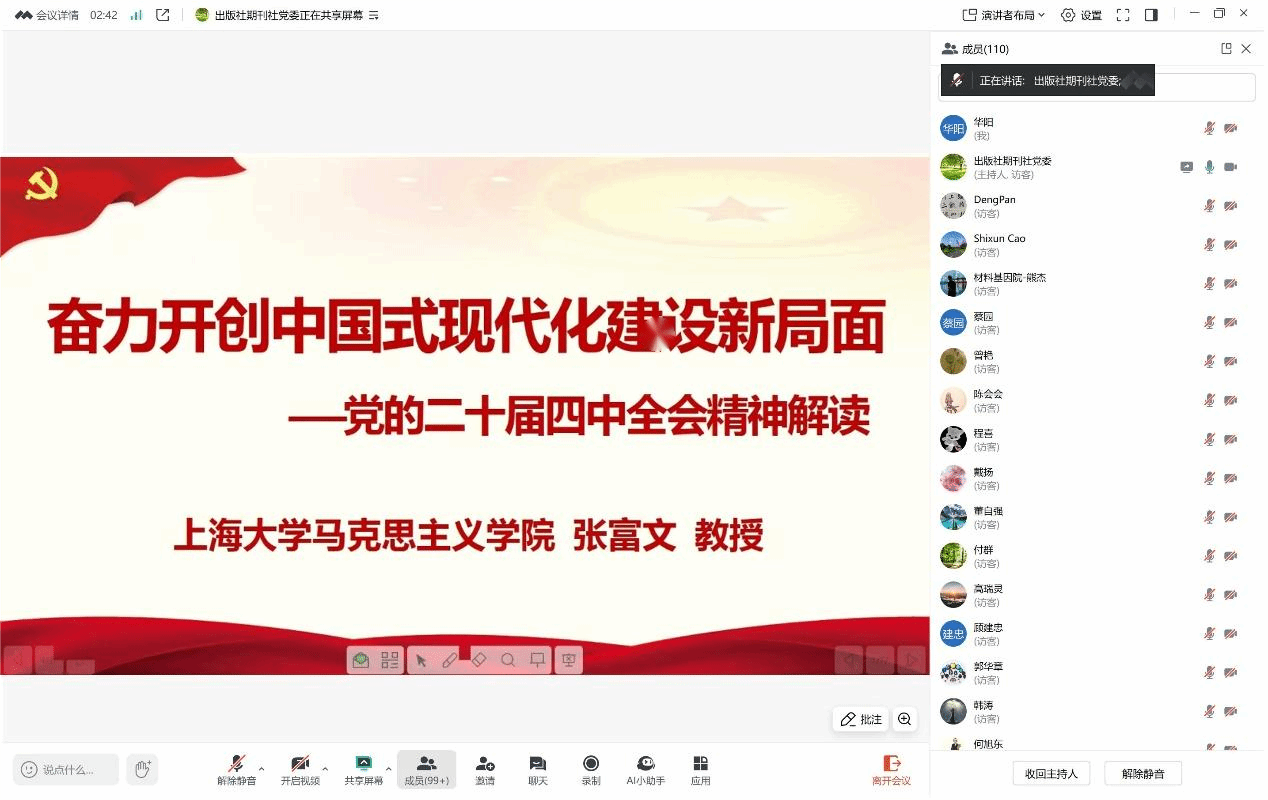 11月19日,出版社期刊社党委组织,环境与化学工程学院党委、文学院党委、外国语学院党委、钱伟长学院党委、新闻传播学院党委、财务处共同开展联组学习。学习会邀请马克思主义学院教授、校党委教师工作部副部长张富文作“党的二十届四中全会精神学习暨师德师风专题培训”。本次学习会采用线上线下相结合的方式,约500名教职员工共同参会。学习会由出版社期刊社党委书记杨密娣主持。
