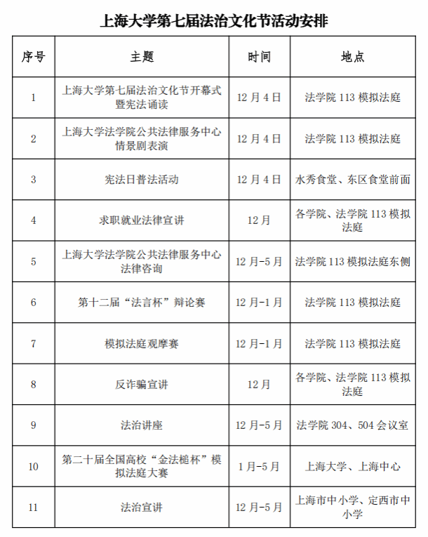 上海大学第七届法治文化节为期六个月,将深度依托法学院的学科优势与普法传统,紧扣时代主题,把学习宣传贯彻习近平法治思想走深走实。活动将通过多元化、常态化的法治传播,让宪法法律知识真正走进师生日常生活,持续厚植校园法治文化土壤,为上海大学“双一流”建设注入坚实法治力量,助力营造尊法学法守法用法的良好校园生态。