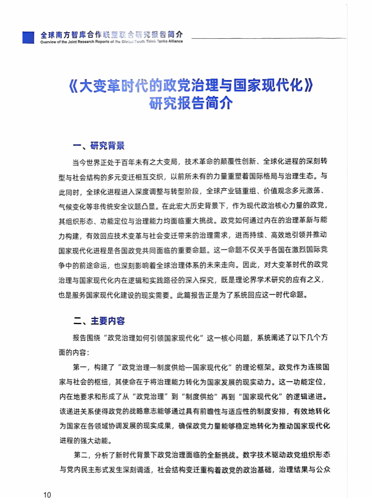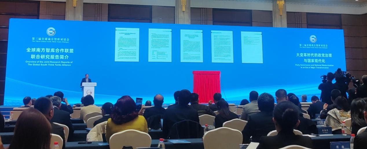 在上午开幕式大会上发布了2025年全球南方智库合作联盟五项联合研究成果,由上海大学政党治理与社会发展研究中心承担,高立伟教授主持负责的《大变革时代的政党治理与国家现代化》研究报告位列其中。