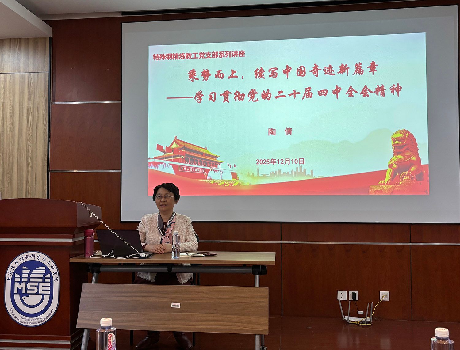 12月10日下午,材料科学与工程学院党委在材料B520报告厅举办“乘势而上,续写中国奇迹新篇章——学习贯彻党的二十届四中全会精神”专题学习会。本次活动由学院党委主办,特殊钢精炼教工党支部具体承办,特邀上海大学学习贯彻党的二十届四中全会精神理论宣讲团专家、国家二级教授、上海大学伟长学者、博士生导师陶倩作专题辅导报告。学习会由学院党委书记黄健主持,学院中心组成员、各教师党支部书记、特殊钢精炼教工党支部、冶金资源综合利用教工党支部及部分研究生党支部党员参加。