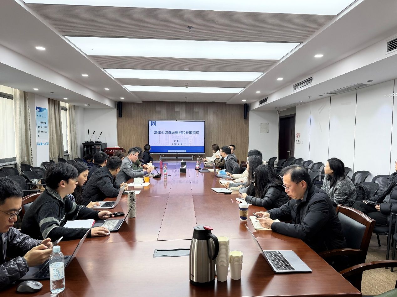 2026年1月9日,法学院决咨课题申请和专报撰写交流研讨会在学院304会议室举行,校科研管理部人文社科艺术处副处长、智库管理办公室主任卢超教授应邀到会指导交流。法学院副院长袁曾以及专业教师等近30人参加会议。会议由法学院党委副书记、副院长于伟主持。