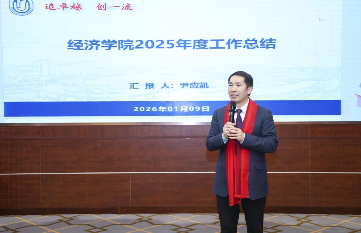 大会由经济学院金融系青年教师贺臻、张洋,本科生辅导员崔一冰,2023级本科生刘淄越联袂主持。在经济学院党委书记尹应凯对学院2025年的工作回顾中,大会正式拉开帷幕。尹应凯以“最经济”为工作汇报主题,从学科建设、人才培养、科学研究等方面全面复盘学院2025年发展答卷,号召经院师生凝心聚力、协同攻坚,在2026年以更高标准、更实举措续写学院高质量发展的新篇章。