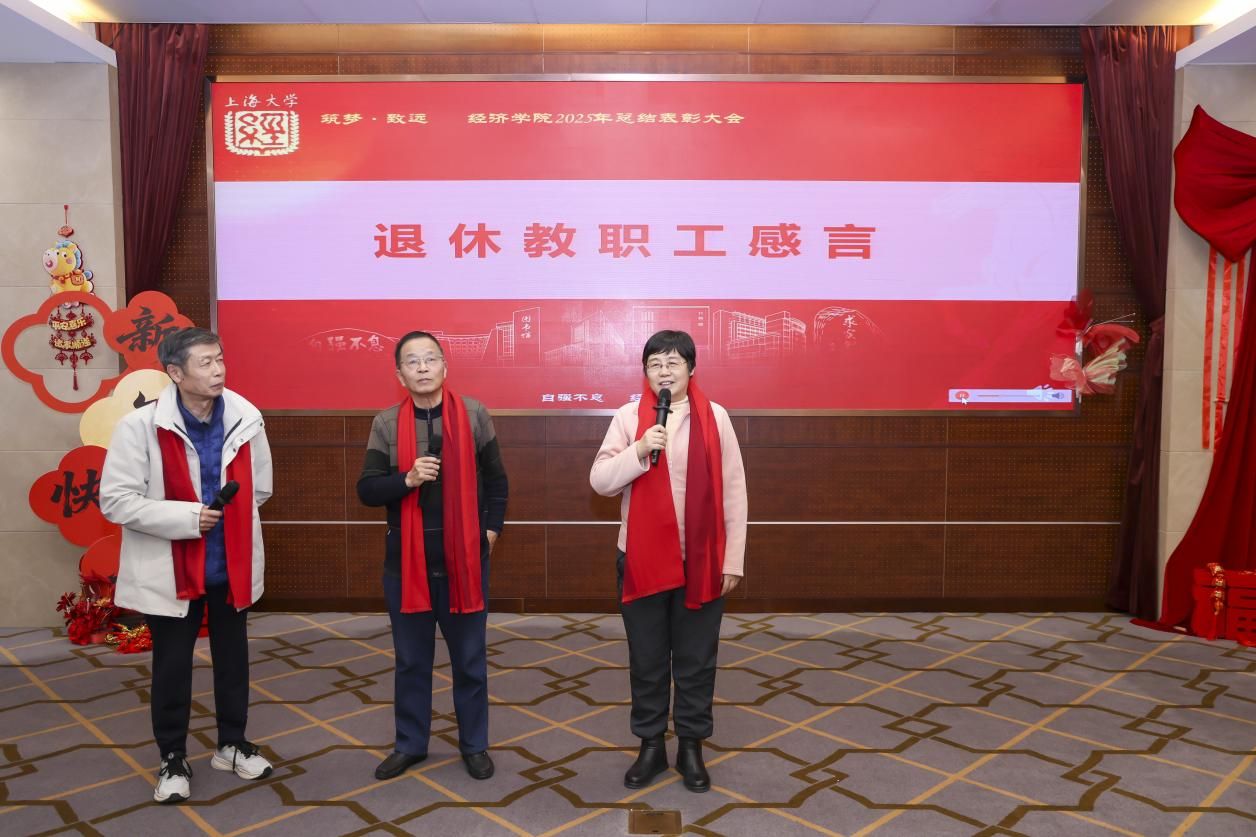 退休教职工教师代表沈瑶、陆瑜芳、章正珊深情分享退休感言,回望执教生涯中深耕杏坛、培育英才的难忘岁月,饱含对经院的深厚情谊,更寄语后辈同仁赓续初心、勇毅前行,言辞间满是坚守与传承的温情。
