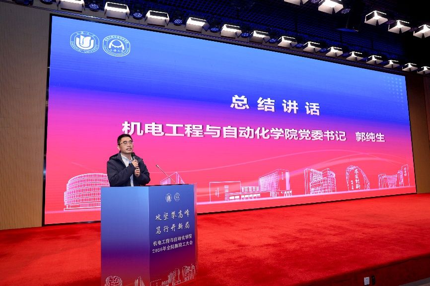 为更好地总结过往成果,交流经验,表彰先进,凝聚力量,谋划未来发展,2月27日,机自学院“攻坚攀高峰,笃行开新局”——2026年全院教职工大会在宝山校区图书馆报告厅顺利召开。上海大学终身教授、原上海大学党委书记、常务副校长方明伦,原上海电力学院校长、原上海市电站自动化技术重点实验室主任曹家麟,上海大学发展规划部部长、战略规划处处长王刚,机自学院党委书记郭纯生,院长谢少荣,学院班子全体成员、各系/中心领导以及学院全体教职工出席了本次会议。