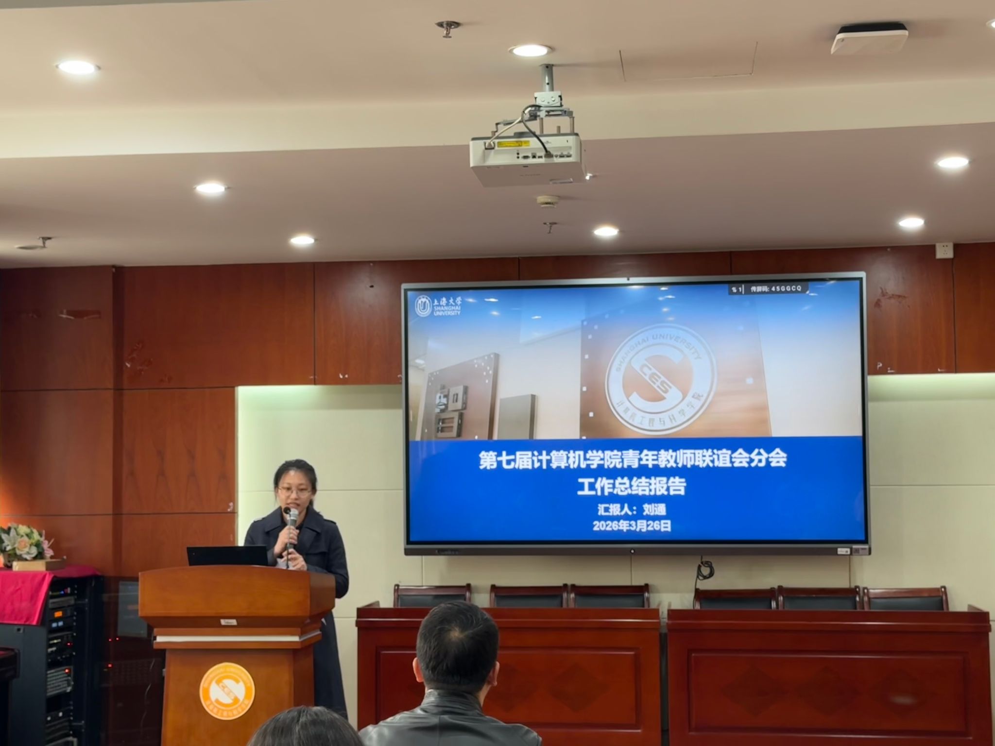 奏唱国歌后,学院第七届青联会会长刘通老师从学术交流、教学沙龙、人才培养、机制建设及凝聚力建设等方面回顾总结了第七届青联会的工作成果。青年教师自身实力过硬,入选人才计划态势迅猛;积极开展学术交流,助力学院一流学科建设;联合工会和妇委会组织多项文体活动,积极参与志愿服务工作。