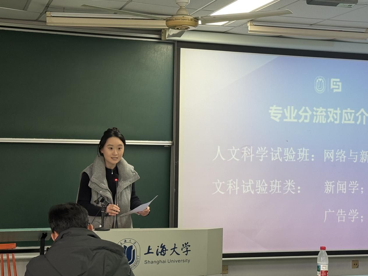 3月27日,上海大学新闻传播学院2026年专业分流宣讲会在宝山校区顺利举行。上海大学新闻传播学院党委书记王晴川,党委副书记、副院长王智君,智能传播系主任王虎,智能视听系主任虞国芳,智能视听系支部书记刘峰,广告学系主持工作副主任刘志杰,广告学系支部书记孟令光,及学院教师代表、学工团队、优秀校友代表与2025级人文科学试验班、文科试验班类学生齐聚一堂,共同探索新闻传播学科的无限可能,此次宣讲会由学院兼职辅导员张宛玉主持。