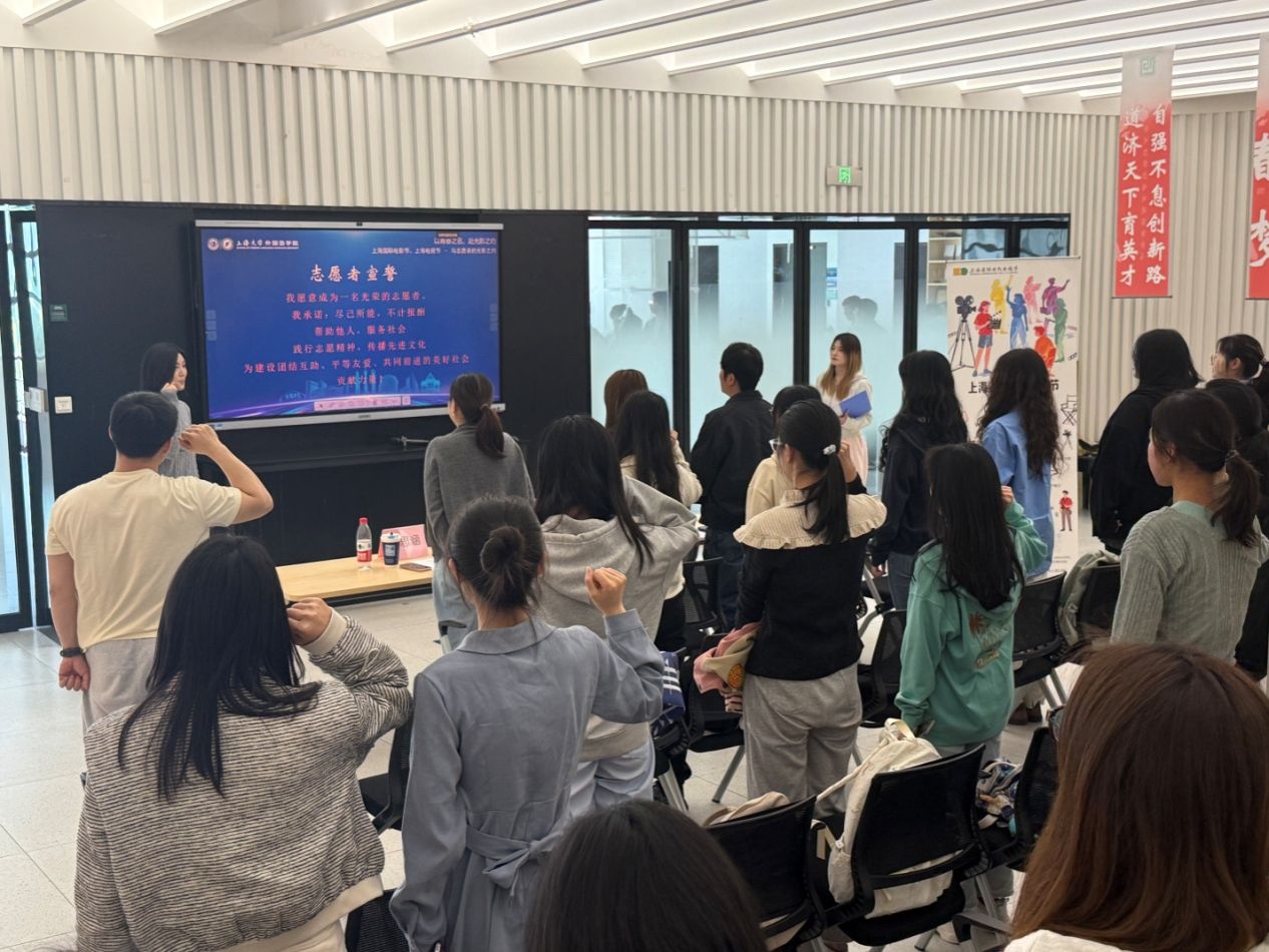 外国语学院2025 级硕士研究生吴婧婧作为新任志愿者代表发言,并带领全体志愿者庄严宣誓。她提出,全体志愿者应立足岗位、明晰职责、精准服务,以专业素养践行志愿初心。同时承诺,将在“两节”志愿服务中,充分展现上大学子的青春风貌、奉献精神与责任担当。