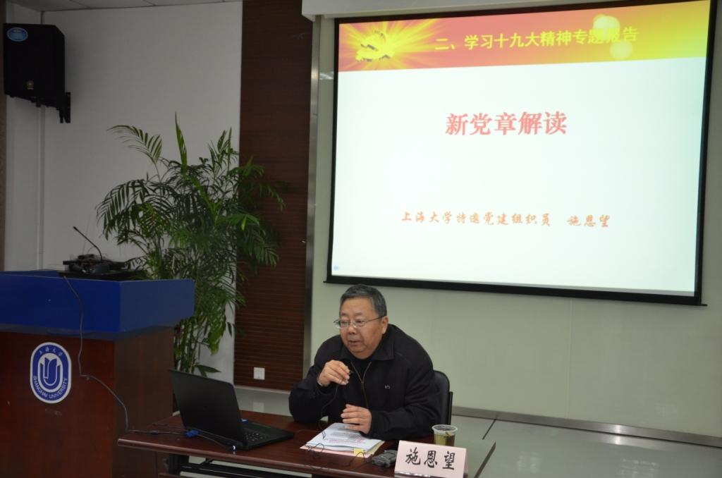 上海大学特邀党建组织员施恩望应邀为学员们解读新党章。报告重点分析了总纲部分修改的内容,并从新党章产生的时代背景、主要内涵、历史贡献和理论特点、实践要求等四方面对贯穿党章的习近平新时代中国特色社会主义思想进行了系统的阐述,对新党章各自然段的内容进行了详细的分析。通过对新党章深入浅出的解读,使学员们对新党章有了更新更高的认识。大家纷纷表示,学习新党章是每个党员的必修课,必须要做到内化于心,外化于行。