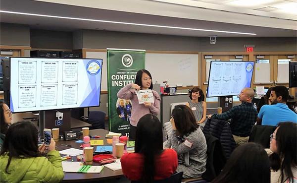 肯塔基大学孔院公派教师李大鹏和陈茜代表中方教师分享了学习体会和收获。两国教师合作完成学习任务,掌握了运用有效的教学方法组织课堂教学和进行教学评估。通过职业培训日活动,中西两国教师建立了网络联系共享资源和信息,新上任教师能够与资深教师建立联系,更快地适应肯塔基州的世界语言教学。