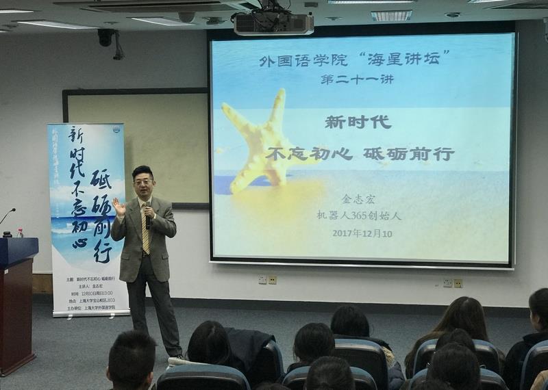 首先,党委副书记曾桂娥老师致辞,并隆重介绍嘉宾。金先生1983年毕业于上海外国语学院分院(现上海大学外国语学院前身),是机器人365创始人,是国内大宗商品交易市场的奠基人和领军人物、互联网金融的首倡者。为了培养一批复合型、应用型,具有国际视野的优秀外语人才,外国语学院于2016年3月隆重推出“海星计划”,旨在为我院学子提供个性化的服务和个性化的培养方案,希望我们的学生早日成为祖国之星。海星是一种海洋生物,契合我院“开放、包容、进取”的海洋文化。海星有五个触手,象征我院学生需要具备的五大基本功“听、说、读、写、译”,通过五大基本功的训练,着力培养学生 “创新、表达、沟通、抗压、快乐”的五大能力。