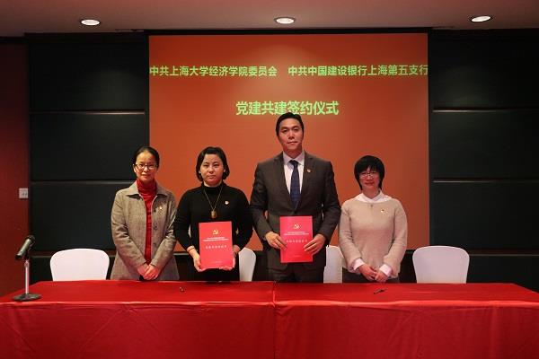 12月1日,中共上海大学经济学院委员会与上海建设银行股份有限公司上海第五支行签署党建共建协议,双方“校银合作、联动育人”战略正式启幕。建行上海分行人力资源部副总经理、组织部副部长夏嵘,建行上海第五支行党委书记、行长夏益君,党委委员、副行长陈洁和王军蕾,上海大学组织人事部副部长、党校常务副校长张洁,上海大学经济学院党委书记陆甦颖、常务副院长聂永有、副院长殷凤和尹应凯、党委委员韩太祥和何树全等参加和签约仪式。签约仪式由建行第五支行党委委员、副行长王伟主持。 签约双方本着加强党建共建、促进资源共享、实现合作共赢的宗旨,围绕双方中心工作,积极创新工作方式,充分发挥党建引领作用,将在党建共建、党建带群建、党建促进业务三个方面开展深度合作。双方将共同搭建联组学习平台,通过联组学习会、研讨会等形式,共同提高党建工作理论水平;尝试利用“互联网+”进一步优化双方党组织管理;利用各自资源优势,共同带领共青团妇组织开展志愿者服务、社会公益活动、文创类竞赛以及青年员工联谊交流等。在党建共建基础上,双方还将积极推动资源流动,构建多元、多层、多形式的校企合作人才培养机制,促进人才联合培养,形成价值共享,校银双赢的共建成果。 签约仪式之前,经济学院党委书记陆甦颖和建行第五支行党委书记、行长夏益君分别就本单位的党建工作的理念和党建工作特色做法及成效进行了介绍交流。签约之后,全体与会人员一起聆听了建设银行总行党校常州分校老师解读十九大报告。本次签约仪式顺利完成,将为双方党建共建工作深入有效开展提供有力保障。