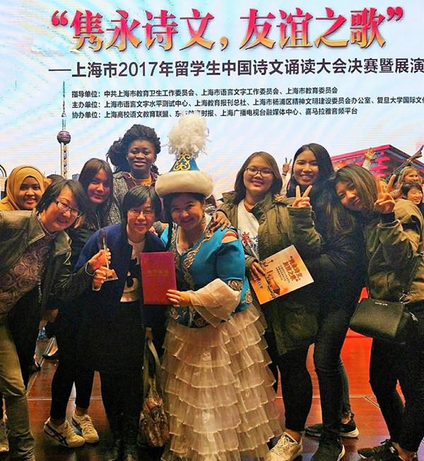 经过艰苦备战,与伴舞、伴奏不断磨合,在19日的决赛中,迪娜在激烈的竞争中脱颖而出,以其纯正的语音、声情并茂的朗诵、艺术化的表现形式,战胜了来自复旦、交大等的一众高手,喜获一等奖,展示了上海大学留学生的语言面貌,提高了上海大学国际教育的知名度。上海大学国际交流学院长年为留学生开设普通话语音训练、诗文朗诵、古文选读、中国文化等语言文化类课程,相信今后还会涌现出更多的像迪娜这样的“中国通”。