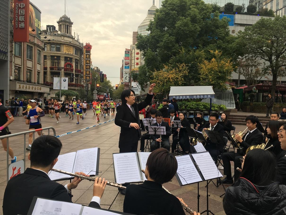 11月12日早上7点,第十五届上海国际马拉松比赛准时鸣枪。上海大学管乐团受邀来到上海南京路步行街的世纪广场进行演出,为奔跑在路上的运动员和参与者加油助威。
