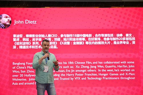 九点,论坛正式开始。本次论坛共分两个单元,分别由上海电影学院副院长、上海电影特效工程技术研究中心副主任丁友东,上海电影特效工程技术研究中心技术委员会副主任张军主持。在第一个单元,棒棒影业创始人CEO John Diet(章迪哲)从宏观角度谈:如何从前期到后期优化中国电影视效流程,详细介绍制作阶段的项目开发、前期筹备、拍摄、视效制作四个流程。Base FX副总裁谢宁从剧本、分镜、预演、拍摄四个方面进行电影《捉妖记》的制作分享。天工异彩副总经理申远向与会者分享天工异彩电影视觉效果技术流程简介,主要包括前期视效设计及跟组部分。诺亦腾影视副总裁以多个项目实例讲述如何从虚拟制作到跨媒体内容生产。MORE VFX技术总监王勇猛从技术角度进行MORE VFX视效电影项目流程搭建经验分享。