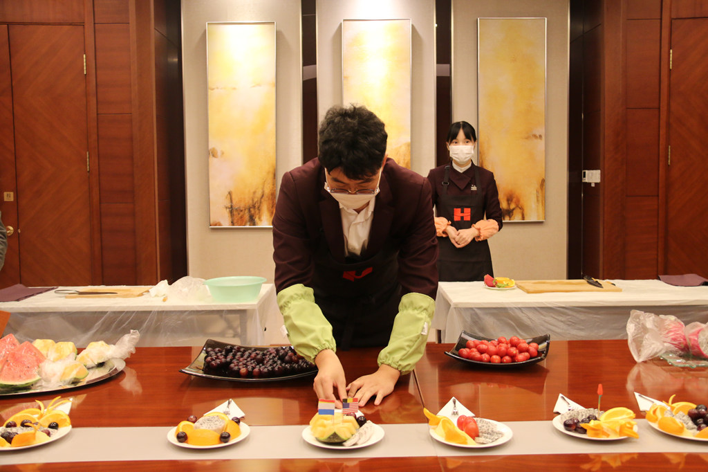 设备操作的考核。想象中,茶歇制作应该姑娘们更擅长、设备操作应该小伙们更拿手;但考评中,小伙们的水果茶歇创意满满丝毫不输姑娘们,姑娘们操作起投影设备来自信满满轻车熟路。