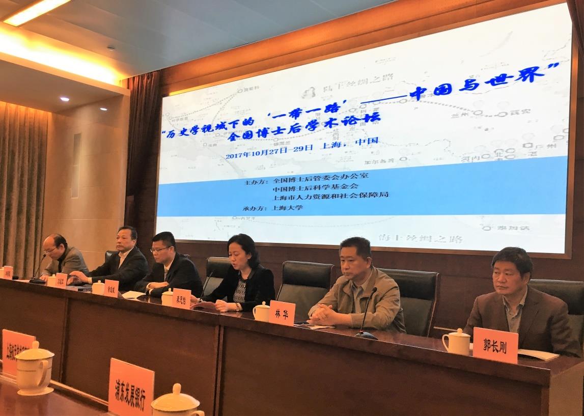 10月27日至29日,在全国博士后管委会办公室、中国博士后科学基金会和上海市博士后管理办公室的大力支持和帮助下,上海大学承办的 “历史学视域下的‘一带一路’——中国与世界”全国博士后学术论坛在乐乎新楼召开。人力资源和社会保障部专业技术人员司博士后处处长刘连军,上海市人力资源和社会保障局副局长余成斌,上海大学党委副书记、副校长龚思怡出席开幕式并致辞,上海大学人事处处长朱明原主持开幕式。出席论坛的还有上海市人力资源和社会保障局专业技术人员管理处处长林华,上海市人力资源和社会保障局专业技术人员管理处副处长孙薇蓉、林晓伟。