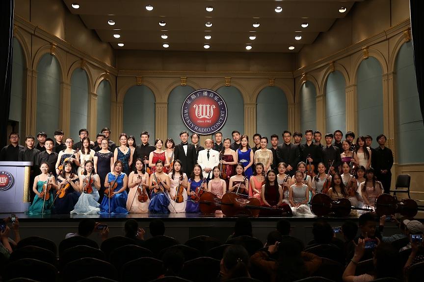 音乐会的尾声,近年来在上海和全国获得多项荣誉的上海大学弦乐团登场,在夏小曹教授的领奏下,演绎了柴科夫斯基的名作《C大调弦乐小夜曲》第一乐章。第一乐章难度非常大,弦乐团充分表现了此乐章的特点,琴声庄重有力,色彩沉郁而略含哀怨但又充满内在活力。曲毕,中国著名指挥家,上海大学音乐学院名誉院长、93岁高龄的曹鹏先生登台,挥棒上海大学弦乐团再次奏响《我的祖国》的优美旋律,为本场音乐会奏响了最有意义的音符。在观众的热烈掌声和阵阵喝彩声中,上海大学弦乐团又加演了《匈牙利舞曲No.5》和《山丹丹开花红艳艳》。