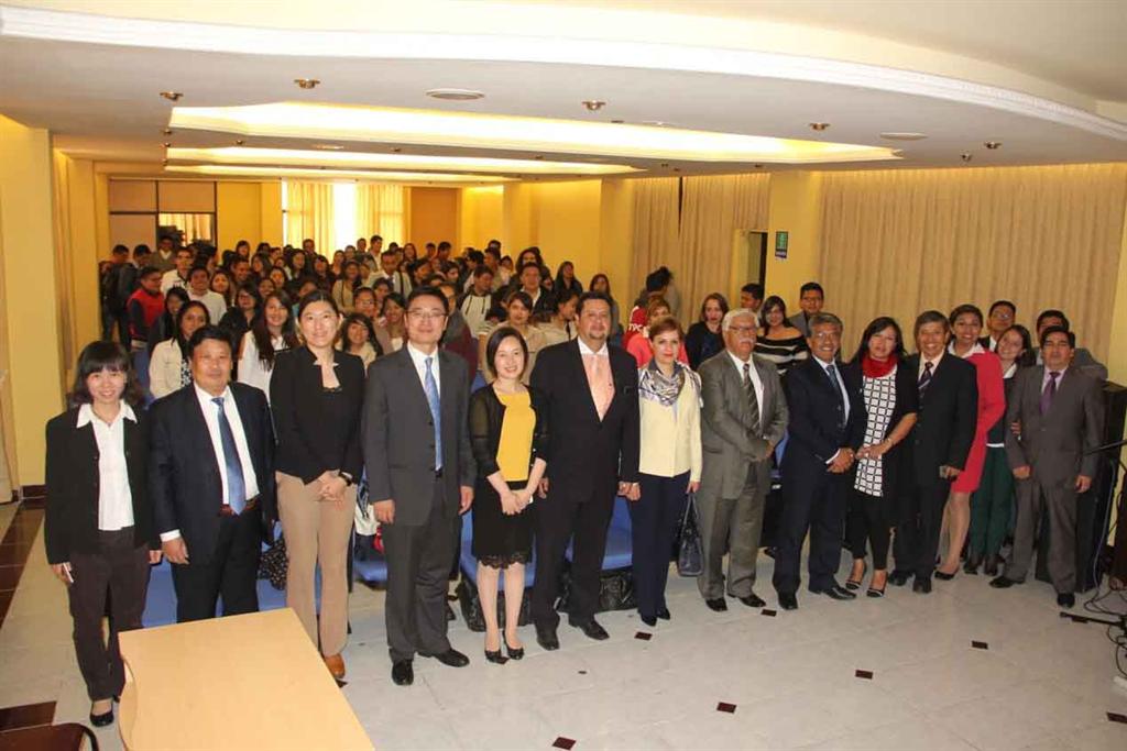 上海大学代表团于厄瓜多尔当地时间7月18日访问钦博拉索理工大学,并就项目申报和合作细节进行全面协商。7月19日上午,双方正式签署“上海大学与钦博拉索理工大学合作举办MBA双学位项目协议”,钦博拉索理工大学校长Byron 、副校长Gloria Miño、Luis Fiallos O等校领导与各学院院长出席签约仪式。随后,国际事务处副处长吴英俊和MBA中心副主任姚佳岑在该校行政学院就上海大学、MBA中心以及合作项目的基本情况分别作了介绍。100余名师生参加了上述活动,会场气氛热烈。