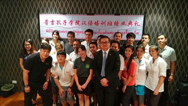8月16日,宋卡王子大学普吉孔子学院为广大宾馆旅游业界开设的2017年度第一期公共汉语培训班,在普吉芭东区西恩纳角Cape Sienna酒店圆满结课。普吉孔院中方院长陈晓达教授、西恩纳角酒店经理Ms.Nalinthip Namjaidee、孔院行政秘书马增福、孔院公派教师马立娟以及参与培训的23名酒店职员共同出席了本次结业典礼。