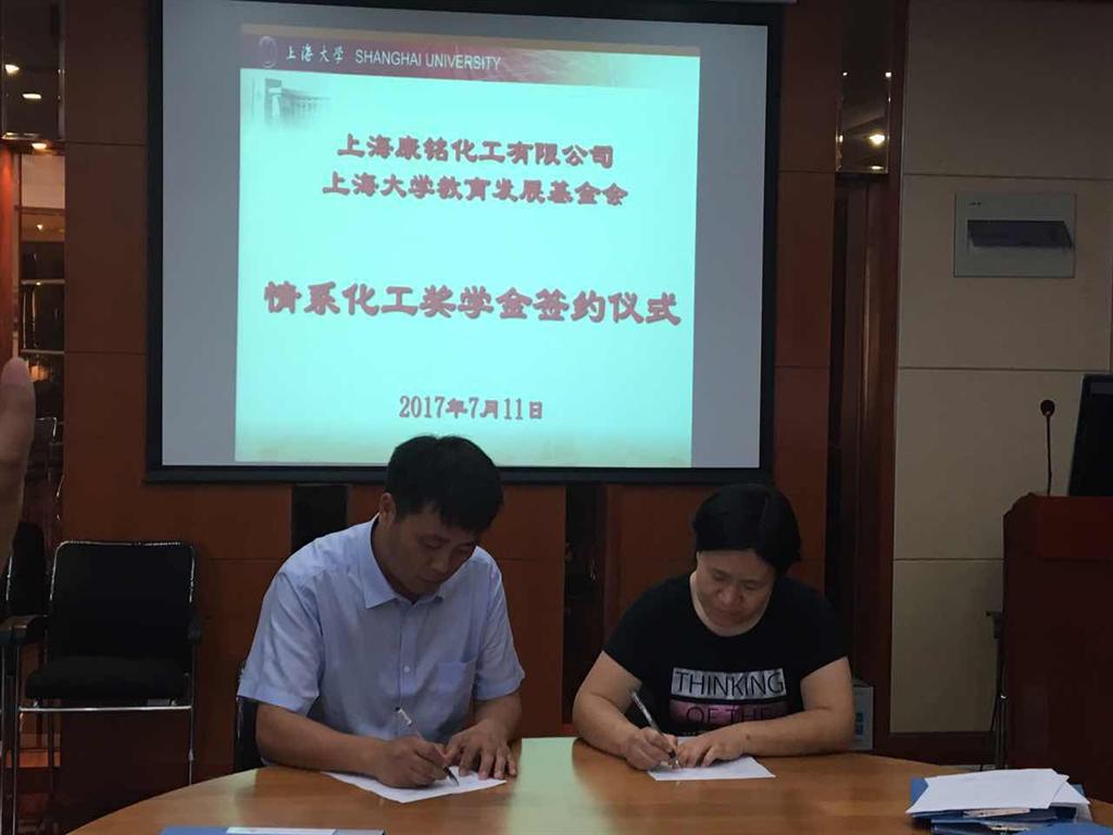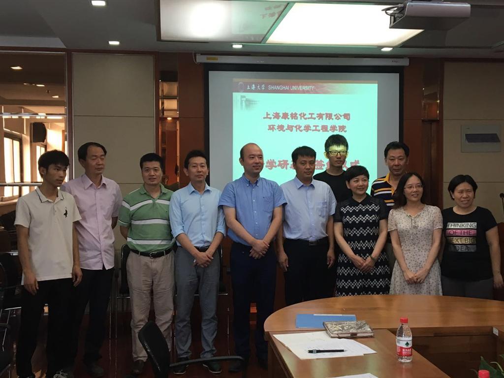 7月11日上午,上海康铭化工有限公司与我院产学研基地建立暨“情系化工奖学金”成立签约仪式在环化楼915会议室举行。上海康铭化工有限公司总经理王二国、副总经理陆伟、应用部经理闻冲、研发部经理杨保臣,上海大学对外联络处副处长、校友会办公室副主任曹俊,环化学院党委书记钱冬英,副书记王宇华等院系党政领导及教师代表出席,签约仪式由环化学院副院长王勇主持。