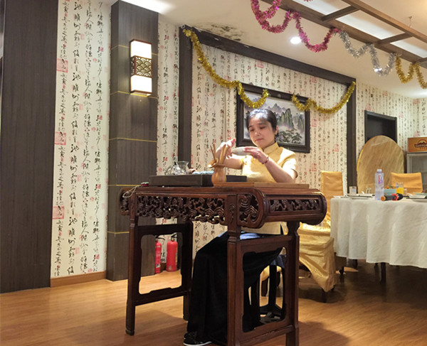 随后的茶艺表演和苏州评弹将欢送会的气氛推向了高潮。袅袅的水雾升起,清冽的茶香沁人心脾,大家仿若置身于一片竹林中,聚精会神地观赏着茶艺老师行云流水般的表演,并随着老师有模有样的品啜甘霖。苏州评弹的两位老师表演了一段经典的《白蛇传》,把许仙与白娘子的初次相遇娓娓道来,两位老师的一个眼神,一个手势,都蕴藏着水乡儿女独特的韵致,大家还饶有兴致地跟两位老师学起了如何用苏州话说“娘子”、“相公”、“夫人”和“官人”,欢送会上笑语连连。