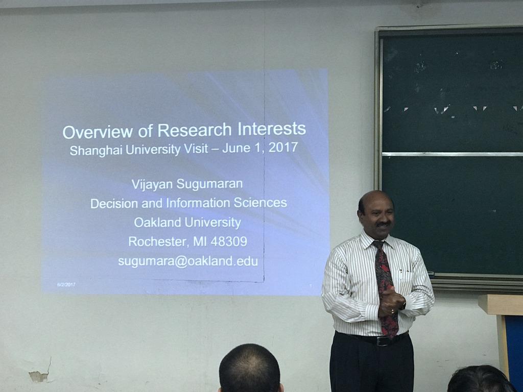 6月2日,作为上海大学海外名师项目来华交流名师,美国奥克兰大学决策与信息科学系主任、管理信息系统教授Vijayan Sugumaran在上海大学悉尼工商学院文德一楼报告厅做了题为“Design Science Research in Information Systems and Publishing in Top Journals”的学术报告,出席此次报告会的有悉尼工商学院副院长吕康娟、工管系、信管系各老师以及悉尼工商学院各专业研究生同学。